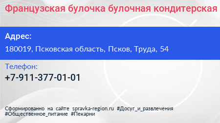 Французская булочка, булочная-кондитерская по адресу 180019, Псковская область, Псков, Труда, 54 в дальнейшем Организация, размещена в следующих категориях: