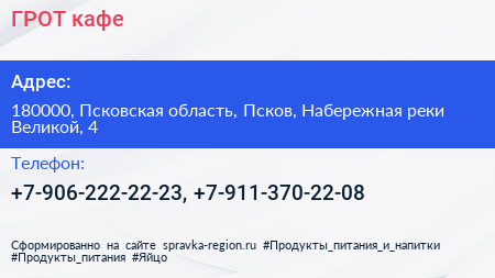 ГРОТ, кафе по адресу 180000, Псковская область, Псков, Набережная реки Великой, 4 в дальнейшем Организация, размещена в следующих категориях: