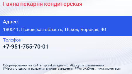 Гаяна, пекарня-кондитерская по адресу 180011, Псковская область, Псков, Боровая, 40 в дальнейшем Организация, размещена в следующих категориях: