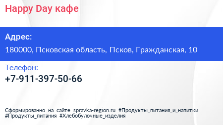 Happy Day, кафе по адресу 180000, Псковская область, Псков, Гражданская, 10 в дальнейшем Организация, размещена в следующих категориях: