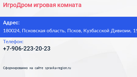 ИгроДром, игровая комната по адресу 180024, Псковская область, Псков, Кузбасской Дивизии, 19 в дальнейшем Организация, размещена в следующих категориях: