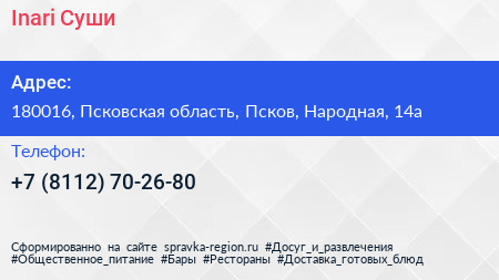 Inari Суши по адресу 180016, Псковская область, Псков, Народная, 14а в дальнейшем Организация, размещена в следующих категориях: