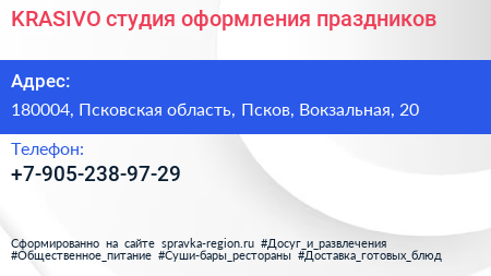 KRASIVO, студия оформления праздников по адресу 180004, Псковская область, Псков, Вокзальная, 20 в дальнейшем Организация, размещена в следующих категориях: