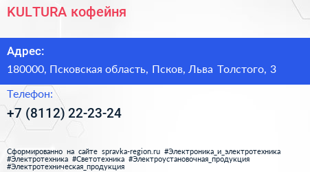 KULTURA, кофейня по адресу 180000, Псковская область, Псков, Льва Толстого, 3 в дальнейшем Организация, размещена в следующих категориях: