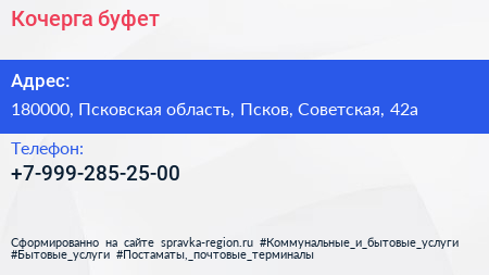 Кочерга, буфет по адресу 180000, Псковская область, Псков, Советская, 42а в дальнейшем Организация, размещена в следующих категориях: