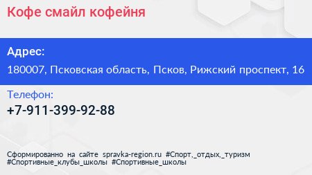 Кофе смайл, кофейня по адресу 180007, Псковская область, Псков, Рижский проспект, 16 в дальнейшем Организация, размещена в следующих категориях: