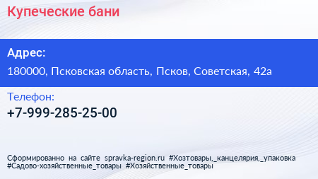 Купеческие бани по адресу 180000, Псковская область, Псков, Советская, 42а в дальнейшем Организация, размещена в следующих категориях: