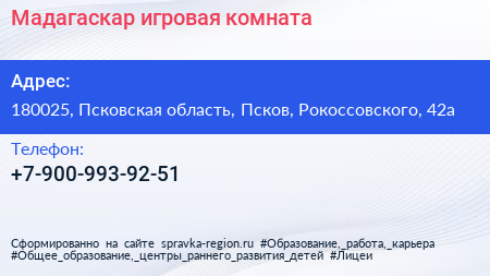 Мадагаскар, игровая комната по адресу 180025, Псковская область, Псков, Рокоссовского, 42а в дальнейшем Организация, размещена в следующих категориях: