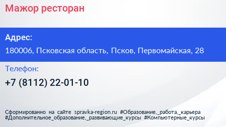 Мажор, ресторан по адресу 180006, Псковская область, Псков, Первомайская, 28 в дальнейшем Организация, размещена в следующих категориях: