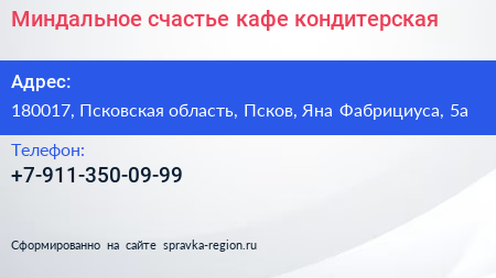 Миндальное счастье, кафе-кондитерская по адресу 180017, Псковская область, Псков, Яна Фабрициуса, 5а в дальнейшем Организация, размещена в следующих категориях: