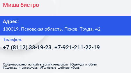 Миша, бистро по адресу 180019, Псковская область, Псков, Труда, 42 в дальнейшем Организация, размещена в следующих категориях:
