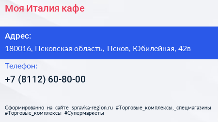 Моя Италия, кафе по адресу 180016, Псковская область, Псков, Юбилейная, 42в в дальнейшем Организация, размещена в следующих категориях: