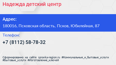 Надежда, детский центр по адресу 180016, Псковская область, Псков, Юбилейная, 87 в дальнейшем Организация, размещена в следующих категориях: