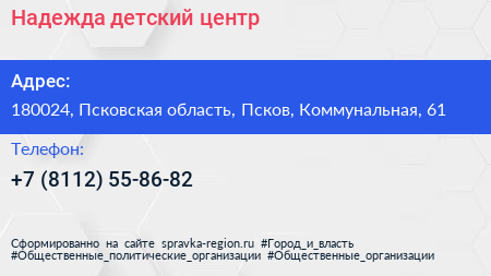 Надежда, детский центр по адресу 180024, Псковская область, Псков, Коммунальная, 61 в дальнейшем Организация, размещена в следующих категориях: