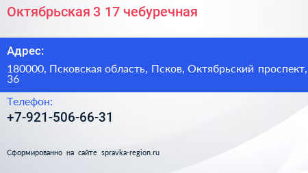 Октябрьская 3/17, чебуречная по адресу 180000, Псковская область, Псков, Октябрьский проспект, 36 в дальнейшем Организация, размещена в следующих категориях: