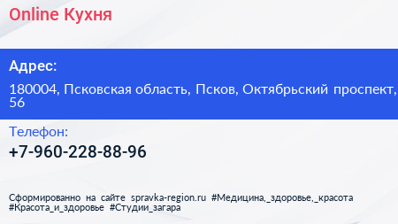 Online Кухня по адресу 180004, Псковская область, Псков, Октябрьский проспект, 56 в дальнейшем Организация, размещена в следующих категориях: