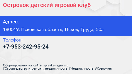 Островок, детский игровой клуб по адресу 180019, Псковская область, Псков, Труда, 50а в дальнейшем Организация, размещена в следующих категориях: