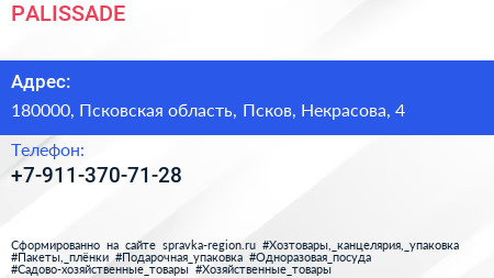 PALISSADE по адресу 180000, Псковская область, Псков, Некрасова, 4 в дальнейшем Организация, размещена в следующих категориях: