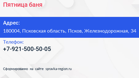 Пятница, баня по адресу 180004, Псковская область, Псков, Железнодорожная, 34 в дальнейшем Организация, размещена в следующих категориях: