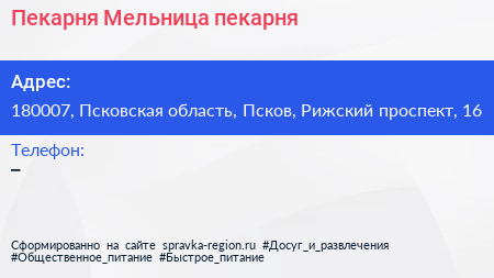 Пекарня-Мельница, пекарня по адресу 180007, Псковская область, Псков, Рижский проспект, 16 в дальнейшем Организация, размещена в следующих категориях: