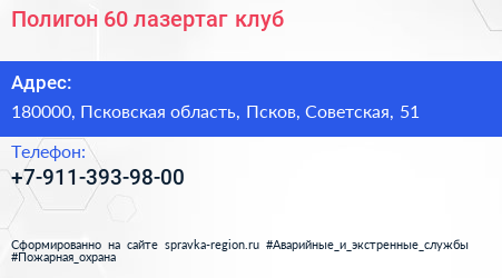 Полигон-60, лазертаг-клуб по адресу 180000, Псковская область, Псков, Советская, 51 в дальнейшем Организация, размещена в следующих категориях: