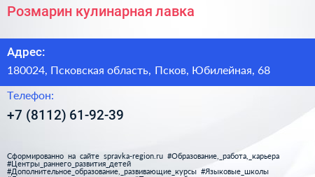 Розмарин, кулинарная лавка по адресу 180024, Псковская область, Псков, Юбилейная, 68 в дальнейшем Организация, размещена в следующих категориях: