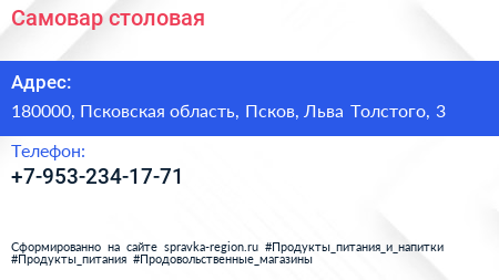 Самовар, столовая по адресу 180000, Псковская область, Псков, Льва Толстого, 3 в дальнейшем Организация, размещена в следующих категориях: