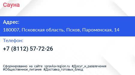 Сауна по адресу 180007, Псковская область, Псков, Пароменская, 14 в дальнейшем Организация, размещена в следующих категориях: