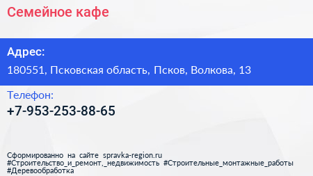 Семейное, кафе по адресу 180551, Псковская область, Псков, Волкова, 13 в дальнейшем Организация, размещена в следующих категориях: