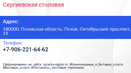 Сергиевская столовая по адресу 180000, Псковская область, Псков, Октябрьский проспект, 19 в дальнейшем Организация, размещена в следующих категориях:
