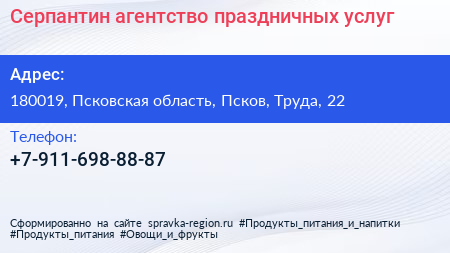 Серпантин, агентство праздничных услуг по адресу 180019, Псковская область, Псков, Труда, 22 в дальнейшем Организация, размещена в следующих категориях: