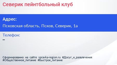 Северик, пейнтбольный клуб по адресу Псковская область, Псков, Северик, 1а в дальнейшем Организация, размещена в следующих категориях: