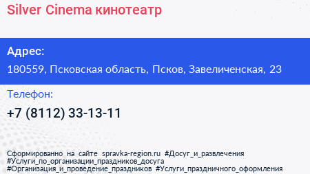Silver Cinema, кинотеатр по адресу 180559, Псковская область, Псков, Завеличенская, 23 в дальнейшем Организация, размещена в следующих категориях: