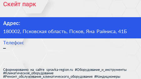 Скейт-парк по адресу 180002, Псковская область, Псков, Яна Райниса, 41Б в дальнейшем Организация, размещена в следующих категориях: