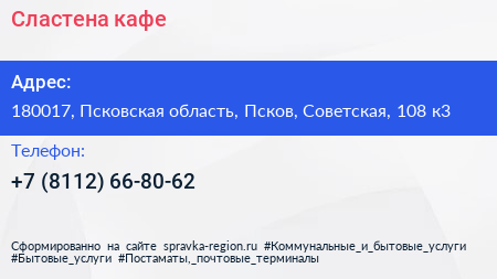 Сластена, кафе по адресу 180017, Псковская область, Псков, Советская, 108 к3 в дальнейшем Организация, размещена в следующих категориях: