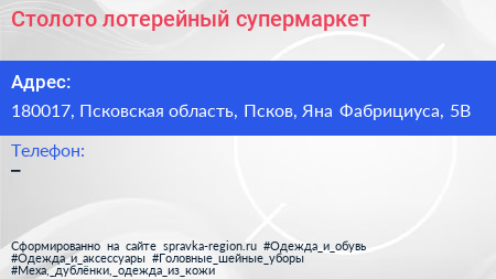 Столото, лотерейный супермаркет по адресу 180017, Псковская область, Псков, Яна Фабрициуса, 5В в дальнейшем Организация, размещена в следующих категориях: