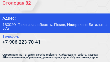 Столовая №82 по адресу 180020, Псковская область, Псков, Ижорского Батальона, 57а в дальнейшем Организация, размещена в следующих категориях: