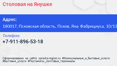 Столовая на Янушке по адресу 180017, Псковская область, Псков, Яна Фабрициуса, 10/13 в дальнейшем Организация, размещена в следующих категориях: