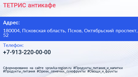 ТЕТРИС, антикафе по адресу 180004, Псковская область, Псков, Октябрьский проспект, 52 в дальнейшем Организация, размещена в следующих категориях: