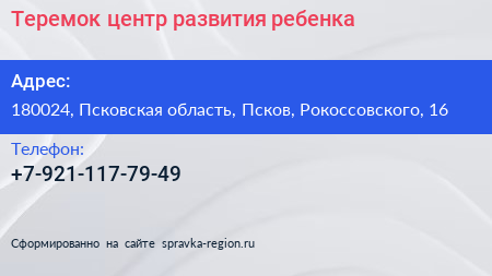Теремок, центр развития ребенка по адресу 180024, Псковская область, Псков, Рокоссовского, 16 в дальнейшем Организация, размещена в следующих категориях: