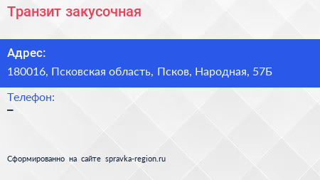 Транзит, закусочная по адресу 180016, Псковская область, Псков, Народная, 57Б в дальнейшем Организация, размещена в следующих категориях: