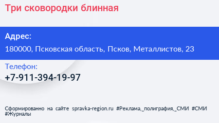 Три сковородки, блинная по адресу 180000, Псковская область, Псков, Металлистов, 23 в дальнейшем Организация, размещена в следующих категориях: