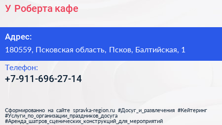 У Роберта, кафе по адресу 180559, Псковская область, Псков, Балтийская, 1 в дальнейшем Организация, размещена в следующих категориях: