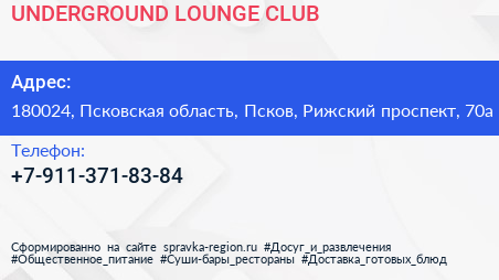 UNDERGROUND LOUNGE CLUB по адресу 180024, Псковская область, Псков, Рижский проспект, 70а в дальнейшем Организация, размещена в следующих категориях:
