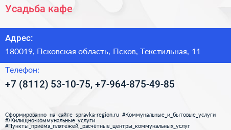 Усадьба, кафе по адресу 180019, Псковская область, Псков, Текстильная, 11 в дальнейшем Организация, размещена в следующих категориях: