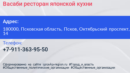 Васаби, ресторан японской кухни по адресу 180000, Псковская область, Псков, Октябрьский проспект, 14 в дальнейшем Организация, размещена в следующих категориях:
