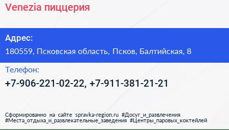 Venezia, пиццерия по адресу 180559, Псковская область, Псков, Балтийская, 8 в дальнейшем Организация, размещена в следующих категориях: