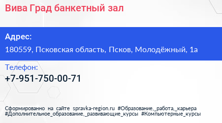 Вива Град, банкетный зал по адресу 180559, Псковская область, Псков, Молодёжный, 1а в дальнейшем Организация, размещена в следующих категориях: