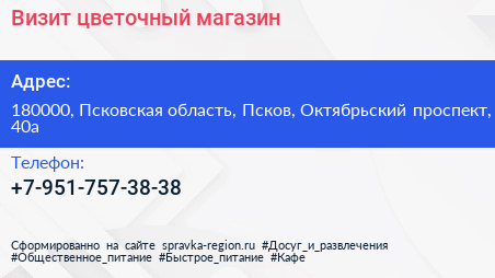 Визит, цветочный магазин по адресу 180000, Псковская область, Псков, Октябрьский проспект, 40а в дальнейшем Организация, размещена в следующих категориях: