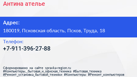 Антина, ателье по адресу 180019, Псковская область, Псков, Труда, 18 в дальнейшем Организация, размещена в следующих категориях: